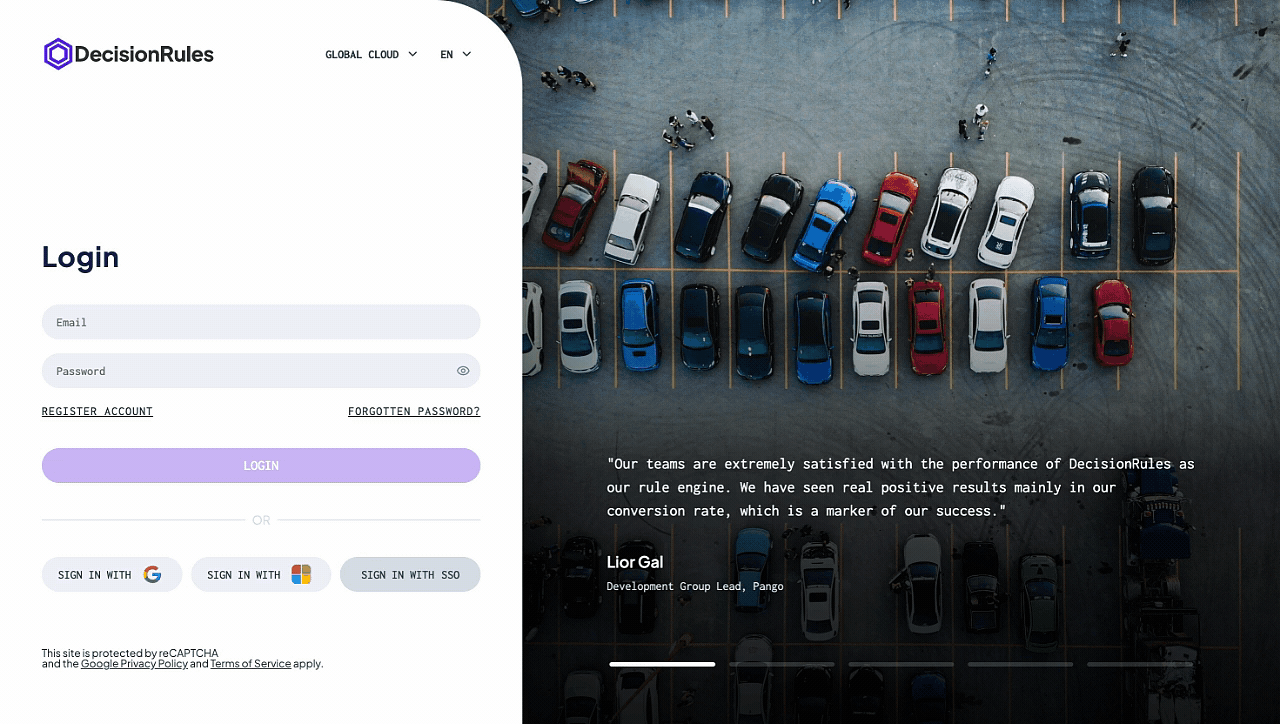 Are you tired of inventing new logins? With one click, you can create an account on <mark style="color:purple;">DecisionRules</mark> with Google and Microsoft SSO. Go to the [<mark style="color:purple;">DecisionRules</mark>](https://www.decisionrules.io/) page. Click on the <mark style="background-color:purple;">**LOGIN**</mark> button at the top of the page. A login page will appear. Simply click the button <mark style="background-color:red;">SIGN IN WITH Google</mark> or <mark style="background-color:green;">SIGN IN WITH Microsoft</mark> to start the sign up.&#x20;