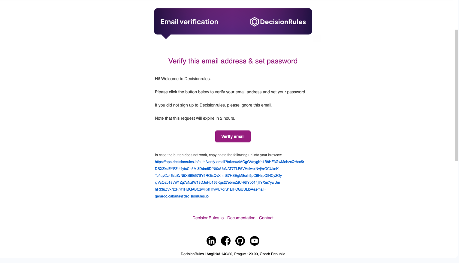 Go to the [<mark style="color:purple;">DecisionRules</mark>](https://www.decisionrules.io/) page. Click on the <mark style="background-color:purple;">**LOGIN**</mark> button at the top of the page. A login screen will appear. There, below the boxes for email and password you will find the "REGISTER ACCOUNT" link. You will be redirected to a register page where you can fill in all the required fields.&#x20;