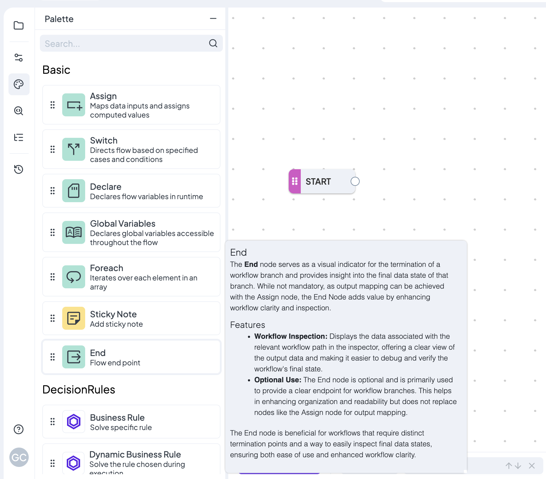 The Designer features a canvas with a single **Start** node. On left side, you’ll find several tabs, with the **Palette** being the most important for now. The Palette lists all available node types with brief descriptions. To use a node, simply drag it from the palette onto the canvas.