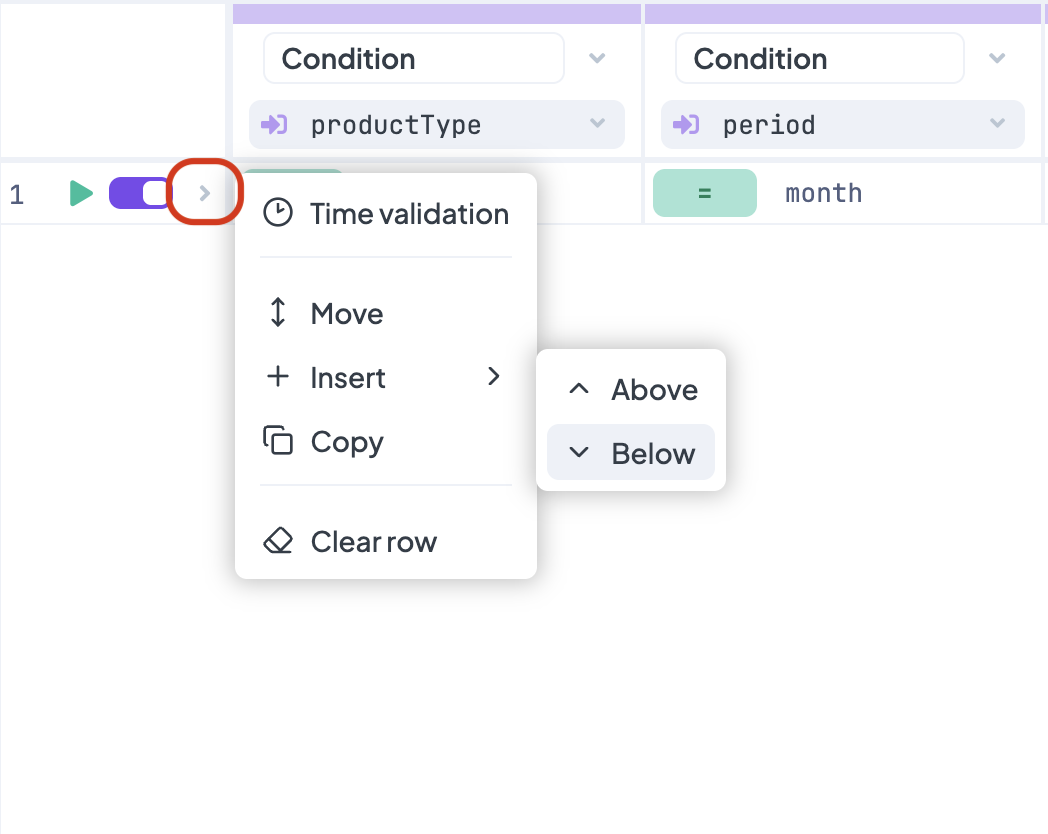You can now click the arrow at the beginning of the row and select **Insert**, and after click on **Below**. This will add another empty row below. Its conditions and results may be set analogically. More rows can be added in a similar fashion. In this way, you can create a rule similar to the following sample rule.