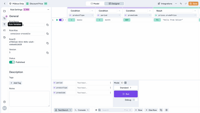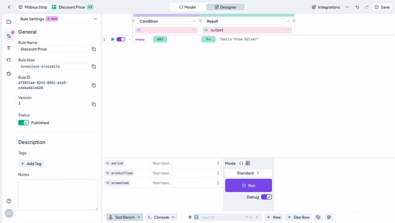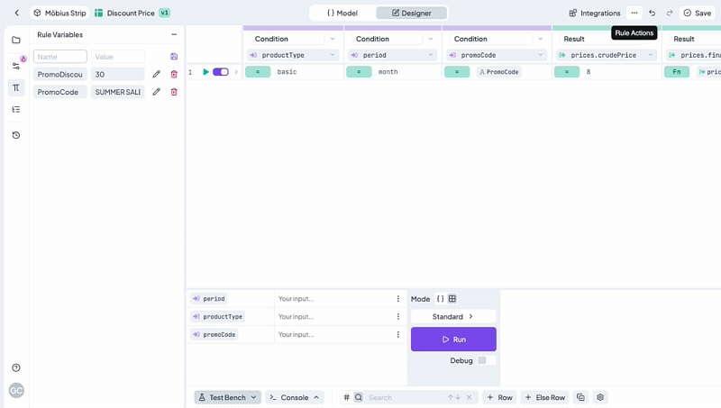 To create conditions and results, you must go to the **Table Designer** tab. Now let's move on and bind our input and output models to our condition and result columns.