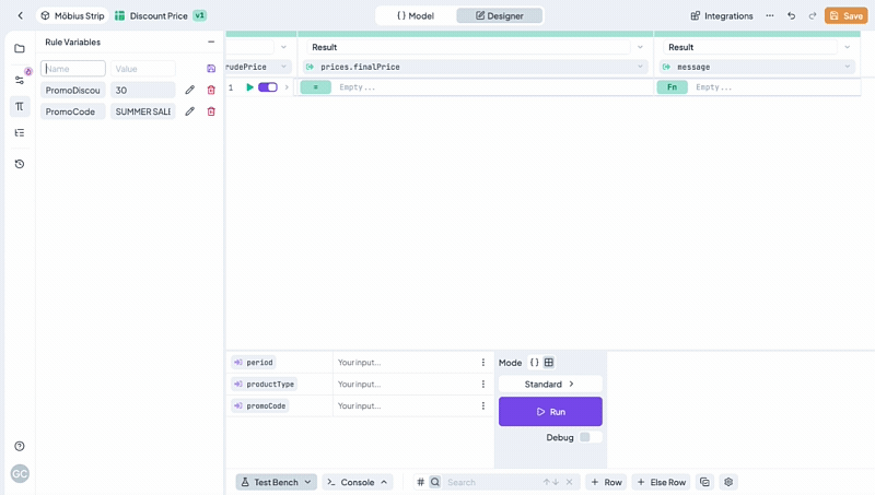 Click Save and go back to the Decision Table Designer. Now you can add the condition for <mark style="color:purple;background-color:purple;">**promoCode**</mark>. Select again the Equals operator and enter `{PromoCode}` in the field. This expression refers to the `PromoCode` Rule variable.