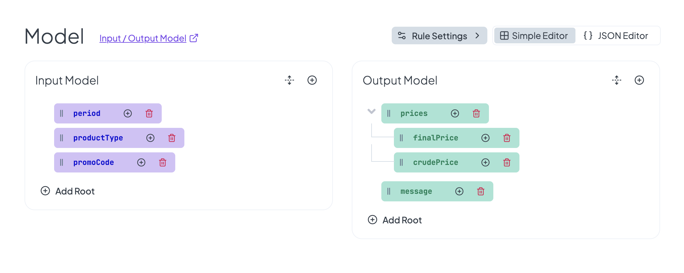 Let's start with the input model. First, you can switch from "Designer" to "Model" at the centre of the top bar. Delete the default attribute "input" by clicking the trash can icon next to the name. Then, add your own attributes: <mark style="color:purple;background-color:purple;">**period**</mark>, <mark style="color:purple;background-color:purple;">**productType**</mark> and <mark style="color:purple;background-color:purple;">**promoCode**</mark>. Create a root for each of them by clicking the **+Add Root** button.
