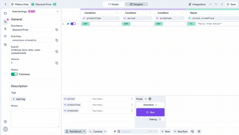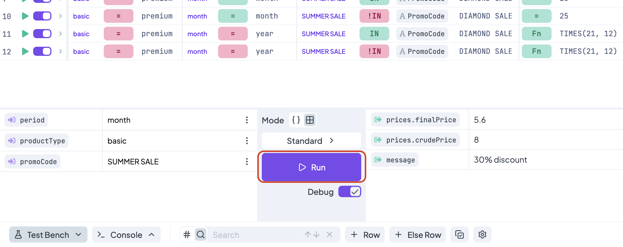 If we want to test a certain row, we can click the <mark style="background-color:purple;">**Test Bench**</mark> icon at its beginning. After clicking the icon, the values from the row will be pre-filled in **Test Bench**, which will show up at the bottom of the page.&#x20;