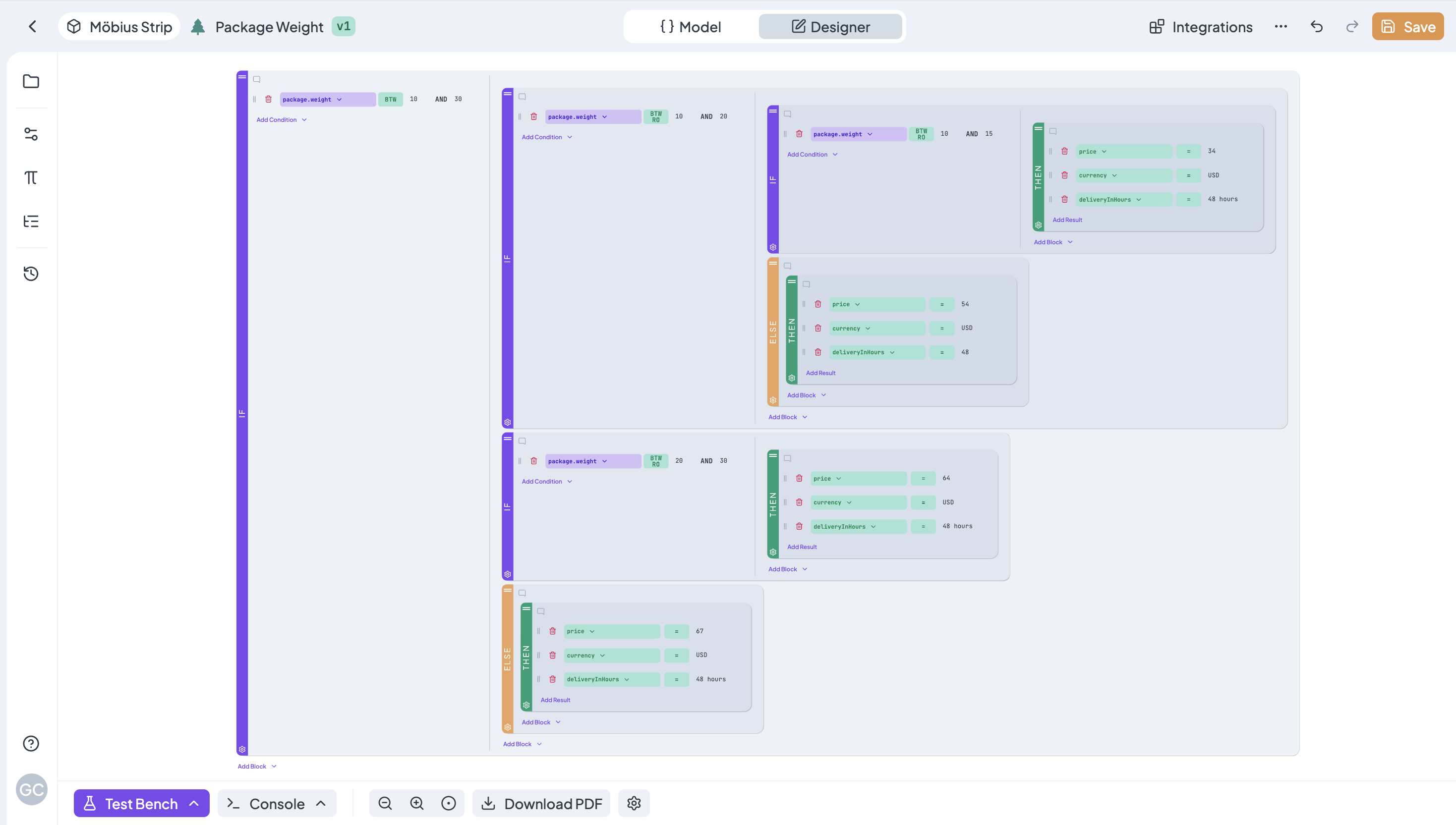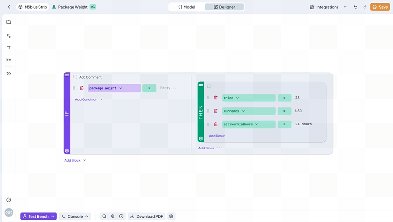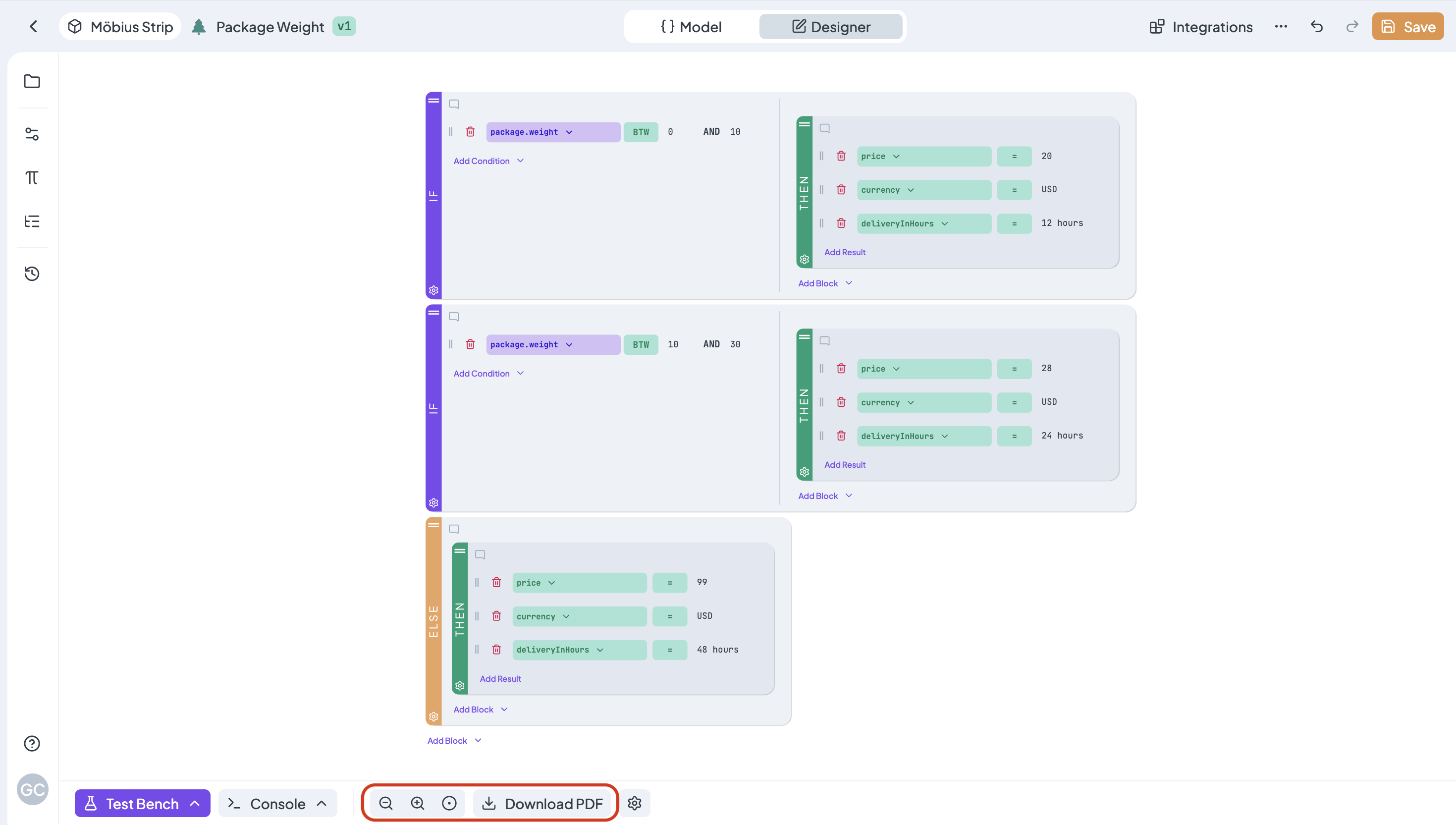 Use the Test Bench with Debug Mode in the bottom bar to quickly and easily test the functionality of your rule. In the bottom bar, you can also use the PDF export of your tree.