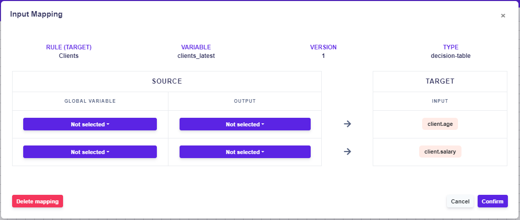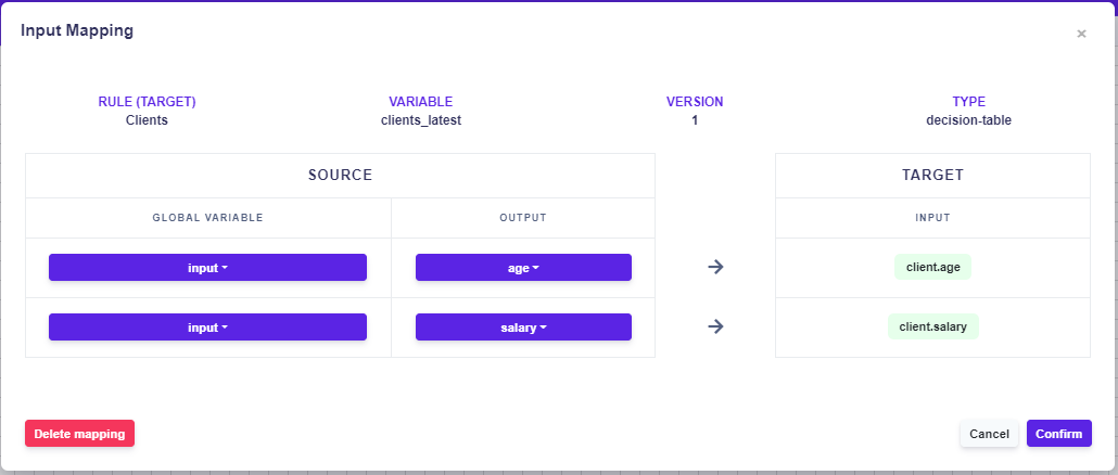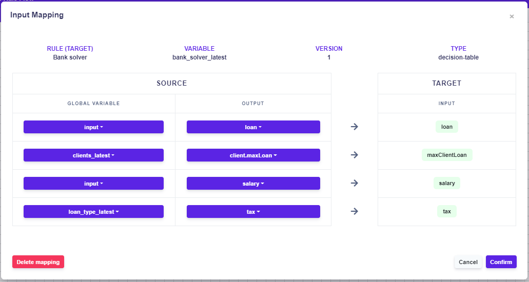 The final output can be data from any rule, so it is necessary to map the Output as well. In this example we want the following data to be in the output: