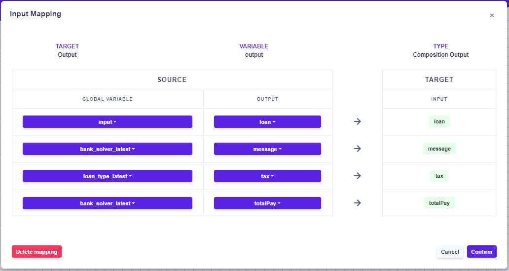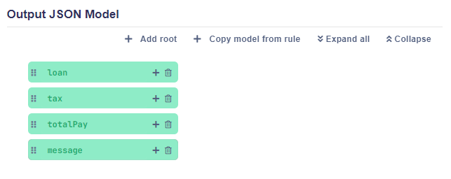 We set the output model similarly, where we set as root **loan**, **tax**, **totalPay** and **message**.
