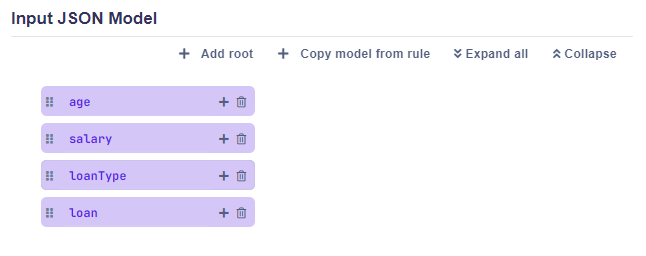First, we delete all created objects by clicking on the icon (in case you chose Sample Rule Flow). Then we will add our specified requirements (**age, salary, loan, loanType**). In our case, we create a root for each request by clicking on the button.